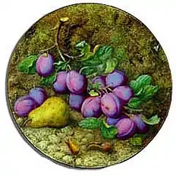 The Royal Worcester fruit painters were a group of painters who specialized in depicting fruits on porcelain tableware. The tradition originated with the painter Octar H. Copson, who in 1880 had also painted a plaque commissioned by a local farmer to commemorate the introduction of the Pershore plum.