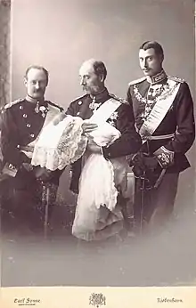 ![]() Prince Frederick of Denmark wears the dåbskjole at his christening in 1899, held by his great-grandfather, Christian IX of Denmark. | |