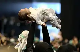Rubab was the daughter of Imra' al-Qais ibn Adi, a chief of the Banu Kalb tribe. Imra' came to Medina early during the caliphate of Umar (r. 634–644) and was given authority over the new converts to Islam from the Quda'a, a confederation of tribes that included the Banu Kalb.[1] During that visit he was approached by Ali ibn Abi Talib, the cousin and son-in-law of the Islamic prophet Muhammad (d. 632). Ali proposed to establish marriage ties with Imra', who gave one of his daughters to Ali in marriage and promised another two to Ali's sons, Hasan (d. 670) and Husayn (d. 680), who were too young at the time.[1] Of the two brothers, only Husayn fulfilled this promise and Rubab was thus his first wife, whom he married in the final years of the caliphate of Ali (r. 656–661).[1] After remaining childless for some years, Rubab gave birth to Sakina, who might have also been Husayn's eldest daughter.[1] Her birthdate is not know with certainty and various reports give the years 47,[2] 49,[3] or 51 AH,[2] that is, circa 671 CE.[3] A short poem is ascribed to Husayn in celebration of his love for Rubab and Sakina.[1][4][5] Rubab later bore Husayn his son Abd-Allah,[1] commonly known as Ali al-Asghar in Shia sources.[1][6] Husayn's kunya, Abu Abd-Allah, probably refers to this son.[1]