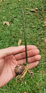 H. brasiliensis is a tall deciduous tree growing to a height of up to 43 m (141 ft) in the wild. Cultivated trees are usually much smaller because drawing off the latex restricts their growth. The trunk is cylindrical and may have a swollen, bottle-shaped base. The bark is some shade of brown, and the inner bark oozes latex when damaged. The leaves have three leaflets and are spirally arranged. The inflorescence include separate male and female flowers. The flowers are pungent, creamy-yellow and have no petals. The fruit is a capsule that contains three large seeds; it opens explosively when ripe.[2]