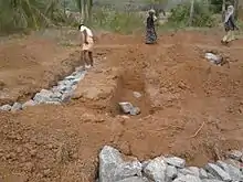 The rubble trench foundation, an ancient construction approach popularized by architect Frank Lloyd Wright, is a type of foundation that uses loose stone or rubble to minimize the use of concrete and improve drainage.[1] It is considered more environmentally friendly than other types of foundation because cement manufacturing requires the use of enormous amounts of energy. However, some soil environments are not suitable for this kind of foundation, particularly expansive or poor load-bearing (< 1 ton/sf) soils.[2] A rubble trench foundation with a concrete grade beam is not recommended for earthquake prone areas.[3]