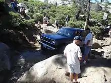 After Rubicon Springs is Cadillac Hill. Cadillac Hill is a series of switchbacks up to Observation Point, starting with a rutted out section with many exposed tree roots. After turning a hairpin the trail becomes very off camber and contains a series of boulders to maneuver around or over. After that is a steep stairstep obstacle to climb. At the top of the hill is Observation Point, a good place to see where you have just driven and to take a short break before the long dirt road back to Lake Tahoe. There are a few small sections of rocks like "Potato Patch" and the "Slabs" after this but nothing that poses a significant obstacle.