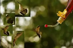 Hummingbirds achieve ability to support their weight and hover from wing beats creating lift on the downstroke of a wing flap and also on the upstroke in a ratio of 75%:25%, respectively, similarly to an insect.[29][30] Hummingbirds and insects gain lift during hovering partially through inversion of their cambered wings during an upstroke.[30] During hovering, hummingbird wings beat up to 80 times per second.[31]