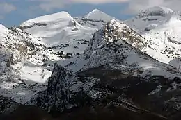 The Ruby Mountains are a mountain range, primarily located within Elko County with a small extension into White Pine County, in Nevada, United States. Most of the range is included within the Humboldt-Toiyabe National Forest.[3] The range reaches a maximum elevation of 11,387 feet (3,471 m) on the summit of Ruby Dome.[4] To the north is Secret Pass and the East Humboldt Range, and from there the Rubies run south-southwest for about 80 miles (130 km). To the east lies Ruby Valley, and to the west lie Huntington and Lamoille Valleys. The Ruby Mountains are the only range of an introduced bird, the Himalayan snowcock, in North America.