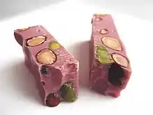 The chocolate is characterized by a taste that has been described as slightly sweet and sour, which is comparable to that of berries, as the chocolate's main characteristic is its acidity.[10][5] In a comparison of the phenolic content between varieties of chocolate, ruby chocolate was rated between milk and white chocolate.[5] According to standards set by the Food and Drug Administration in the United States ruby chocolate must contain a minimum of 1.5% nonfat cacao solids and a minimum of 20% by weight of cacao fat.[11] It may contain antioxidants, spices, and other natural and artificial flavorings; however, these ingredients cannot mimic the flavors of chocolate, milk, butter, or a fruit, and it cannot contain additional colouring.[12]