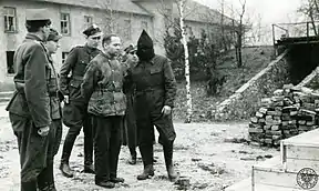 In the last days of the war, Himmler advised Höss to disguise himself as a member of the Kriegsmarine. Adopting the pseudonym "Franz Lang" and working as a gardener, Höss lived in Gottrupel, Schleswig-Holstein with his family and evaded arrest for nearly a year.[53][54] In 1946, Hanns Alexander, a German Jew who had fled to England in 1936 and became a Nazi hunter working for the British government's "No. 1 War Crimes Investigation Team", managed to discover Höss's location. Alexander, who was then a captain in the Royal Pioneer Corps, travelled to Höss's residence with a group of British soldiers, many of whom were also Jewish. Alexander's men unsuccessfully interrogated Höss's daughter Brigitte for information; according to Brigitte, the soldiers subsequently started to beat her brother Klaus, leading to Höss's wife to give up his location.[55][56] According to Alexander, Höss attempted to bite into a cyanide pill once he was discovered by the soldiers.[57] He initially denied his identity, "insisting he was a lowly gardener, but Alexander saw his wedding ring and ordered Höss to take it off, threatening to cut off his finger if he did not. Höss' name was inscribed inside. The soldiers accompanying Alexander began to beat Höss with axe handles. After a few moments and a minor internal debate, Alexander pulled them off."[53][58]