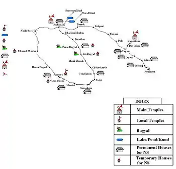 There are numerous sacred water tanks ("Kund") near the temple. These include Surya-kund, Chandra-kund, Tara-kund, Mana-Kund etc. Nanda Devi, Trishul and Nanda Ghunti are the famous mountain peaks, which provide the backdrop to the temple.[9] The holy river Vaitarani or Baitarani or Rudraganga flows near the temple, which has a grey stone idol of Rudranath.[1][10] The river is identified with the "river of salvation", where souls of the dead cross to reach the other world. Thus, devotees visit Rudranath to perform rituals of the dead, such as performing a pind offering. Some believe that offering a pind to ancestors here equals offering a hundred million at the holy city of Gaya.[1][9] The mountain peaks of Trisul, Nanda Devi, Devasthan, Hathi Parbat and Nanda Ghunti are visible from Rudranath.[3] The name "Rudranath", literally means, "Him who is Angry." The mountain cave of Rudranath was modified into the temple we see today.