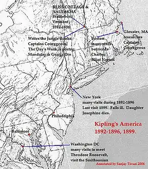 Starting his North American travels in San Francisco, Kipling went north to Portland, Oregon, then Seattle, Washington, up to Victoria and Vancouver, British Columbia, through Medicine Hat, Alberta, back into the US to Yellowstone National Park, down to Salt Lake City, then east to Omaha, Nebraska and on to Chicago, then to Beaver, Pennsylvania on the Ohio River to visit the Hill family. From there, he went to Chautauqua with Professor Hill, and later to Niagara Falls, Toronto, Washington, D.C., New York, and Boston.[34]