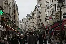 Rue Montorgueil (French pronunciation: [ʁy mɔ̃tɔʁɡœj]) is a street in the 1st arrondissement and 2nd arrondissement (in the Montorgueil-Saint Denis-Les Halles district) of Paris, France. Lined with restaurants, cafés, bakeries, fish stores, cheese shops, wine shops, produce stands and flower shops, rue Montorgueil is a place for Parisians to socialize while doing their daily shopping. At the southernmost tip of rue Montorgueil is Saint-Eustache Church, and Les Halles, containing the largest indoor (mostly underground) shopping mall in central Paris; and to the north is the area known as the Grands Boulevards. While cars are not banned from the street, the priority is for pedestrians who can enjoy the cafes and shops while walking down the cobblestones.