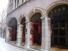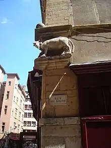 The rue du Bœuf, like the rue Saint-Jean, was created to the late 3rd century after the inhabitants of Fourvière, the upper town of Lugdunum, were deprived of water and forced to descend to the Saône to gradually build a whole neighborhood, where is the current Vieux Lyon. The street was once inhabited by wealthy merchants of Lyon,[3] as the rue Saint-Jean, and was formerly part of the rue Tramassac[4] which it extends, and had this name before 1586. There was a Mint in the street, which was transferred to the Hôtel du Grollier in 1590.[5] In the 16th century, when a statue of cattle was carved, located in the niche that is at the corner of the Place Neuve Saint Jean, the street received its current name.[6] The statue was first attributed to Jean de Bologne, then to Martin Hendricy, from Liège, who went in Lyon circa 1640.[2] In 1650, the street was extended at north to the rue Gadagne, providing better traffic in the area, drawing a parallel to the rue Saint-Jean. In 1722, it was enlarged on the side of the rue du Chemin Neuf. On 18 February 1822, at 8:45 am, several houses in the street were shattered by an earthquake.[7] In 1825, there were 315 silk looms and 150 workshops in the street. The Nos. 2 and 36 were bequeathed to the hospitals of Lyon, respectively in 1857 and 1884.[8]