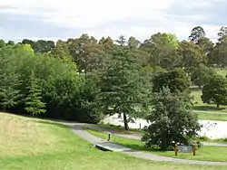 Ruffey Lake Park (locally Ruffeys) is a park in the City of Manningham, Melbourne, Victoria, Australia. It is situated around Ruffey Lake in a portion of a valley through which the Ruffey Creek runs, forming the border between Doncaster and Templestowe. It has three main entrances, Victoria St, The Boulevard and King St. Despite being the second largest park in Manningham, second to Westerfolds Park, it is the biggest urban park managed by the City of Manningham. It is approximately 68 hectares (168 acres) in size.[1] Formerly orchards, the park has a diverse ecology; this includes a riparian strip of native bushland around the creek, areas of pine trees planted by early settlers and pockets of fruit trees remaining from past orchards.
