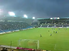 The stadium underwent a major redevelopment in 1994–1995, becoming an all-seater stadium with a capacity of 15,003.[1][2] During 1994–95 season the stadium capacity was significantly reduced as a result of the construction of three new stands within the groups which were the Moffat Stand, the Chadwick Stand and the East Stand. The completion of these three stands reduced the capacity of the stadium to 18,128.[4] The renovated stadium opened on 6 August 1995, with a friendly match against Blackburn Rovers F.C.[4] Rugby Park has since undergone recent developments regarding further renovations, with an artificial pitch being installed in the summer of 2014, safe standing available from November 2019 and underground heating installed underneath the pitch in 1999.[5] In August 2010, the West Stand was renamed the Frank Beattie Stand in honour of former player Frank Beattie who captained Kilmarnock to the historic Scottish League Championship victory in 1965.[6]