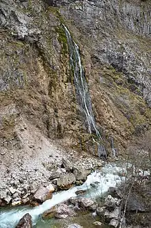 Eighty-five percent of the territory is covered by forests, while fifteen percent is alpine pasture. The terrain is rugged, with steep limestone slopes and deep, narrow, erosive gorges. The mountains have a slope of 15–30°, but occasionally reach 45–90°. The terrain contains various karstic features such as caves, natural tunnels, waterfalls, and glacial lakes.[5]