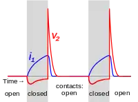 To operate the coil continually, the DC supply current must be repeatedly connected and disconnected to create the magnetic field changes needed for induction.[1] To do that, induction coils use a magnetically activated vibrating arm called an interrupter or break (A) to rapidly connect and break the current flowing into the primary coil.[1] The interrupter is mounted on the end of the coil next to the iron core. When the power is turned on, the increasing current in the primary coil produces an increasing magnetic field, the magnetic field attracts the interrupter's iron armature (A). After a time, the magnetic attraction overcomes the armature's spring force, and the armature begins to move. When the armature has moved far enough, the pair of contacts (K) in the primary circuit open and disconnect the primary current. Disconnecting the current causes the magnetic field to collapse and create the spark. Also, the collapsed field no longer attracts the armature, so the spring force accelerates the armature toward its initial position. A short time later the contacts reconnect, and the current starts building the magnetic field again. The whole process starts over and repeats many times per second. The secondary voltage v2 (red, left), is roughly proportional to the rate of change of primary current i1 (blue).