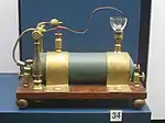 An induction coil or "spark coil" (archaically known as an inductorium or Ruhmkorff coil[1] after Heinrich Rühmkorff) is a type of electrical transformer[2][3][4] used to produce high-voltage pulses from a low-voltage direct current (DC) supply.[1][5] To create the flux changes necessary to induce voltage in the secondary coil, the direct current in the primary coil is repeatedly interrupted by a vibrating mechanical contact called an interrupter.[1] Invented in 1836 by Nicholas Callan, with additional research by Charles Grafton Page and others,[1] the induction coil was the first type of transformer. It was widely used in x-ray machines,[1][6] spark-gap radio transmitters,[1][6] arc lighting and quack medical electrotherapy devices from the 1880s to the 1920s. Today its only common use is as the ignition coils in internal combustion engines and in physics education to demonstrate induction.