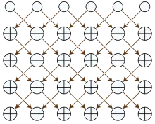 In the mathematical study of cellular automata, Rule 90 is an elementary cellular automaton based on the exclusive or function. It consists of a one-dimensional array of cells, each of which can hold either a 0 or a 1 value. In each time step all values are simultaneously replaced by the exclusive or of their two neighboring values.[1] Martin, Odlyzko & Wolfram (1984) call it "the simplest non-trivial cellular automaton",[2] and it is described extensively in Stephen Wolfram's 2002 book A New Kind of Science.[3]