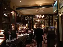 Efforts have been made to carefully preserve the original features in the main restaurant and in the cocktail bar. The walls are decorated with a series of sketches, oil paintings and cartoons which have been collected throughout its history. A number of its artworks depict theatrical history. Rules has been frequented by Henry Irving and Laurence Olivier amongst others.[4]