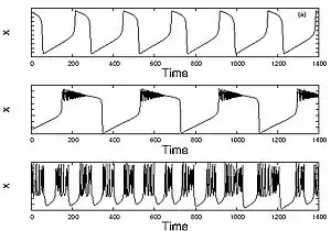 where represents the membrane potential of the neuron. The variable in the model is a slow variable due to a very small value of . Unlike variable , variable does not have explicit biological meaning, though some analogy to gating variables can be drawn.[2] The parameter can be thought of as an external dc current given to the neuron and is a nonlinearity parameter of the map. Different combinations of parameters and give rise to different dynamical states of the neuron like resting, tonic spiking and chaotic bursts. The chaotic bursting is enabled above