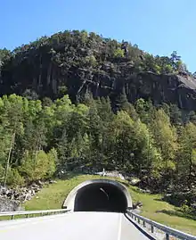 The Rullestad Tunnel (Norwegian: Rullestadtunnelen) is a road tunnel in Etne municipality in Vestland county, Norway. The 2,920-metre (9,580 ft) long tunnel is located on the European route E134 highway, about 4 kilometres (2.5 mi) east of the village of Fjæra and about 9 kilometres (5.6 mi) southwest of the village of Skare in neighboring Ullensvang municipality. The tunnel opened on 30 June 2006 to replace a narrow, winding mountain road that included some hairpin turns. The new tunnel has a maximum grade of 6.6%.[1]