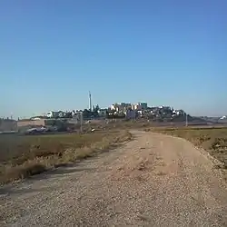 A small village built of stone, and containing about 70 Moslems. It is situated on a low ridge above the plain, and there are a few olive-trees around. The water supply is from cisterns and a well.[12]