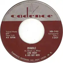 Eventually the instrumental came to the attention of record producer Archie Bleyer of Cadence Records, who hated it, particularly after Wray poked a pencil through the cone of his amplifier to make the recording sound more like the live version.[9][10] But Bleyer's stepdaughter loved it, so he released it despite his misgivings.[11] Phil Everly heard it and suggested the title "Rumble", as it had a rough sound and said it sounded like a street fight.[10]