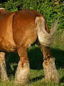 In horse anatomy, the croup refers specifically to the topline of the horse's hindquarters and surrounding musculature, beginning at the hip, extending proximate to the sacral vertebrae and stopping at the dock of the tail (where the coccygeal vertebrae begin). Below the croup is the thigh or haunch. Behind the thigh is the buttock. On horses appearing in parades and other public ceremonies, the croup may be decorated with a pattern in the horse's hair, formed by applying hair gel or spray, then brushing patches of hair in opposite directions.