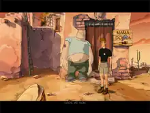 Runaway: A Road Adventure is a graphic adventure game controlled with a point-and-click interface, in a style that has been compared to LucasArts adventure games. Using a mouse, the player navigates the player character through the game world and interacts with hotspots, such as items and non-player characters. Interaction with hotspots is context-sensitive. For example, if the cursor transforms into a magnifying glass while hovering over a hotspot,[1] the player may click to learn more about the object highlighted.[2] When the cursor transforms into a hand or speech balloon, it indicates that a hotspot may be manipulated or spoken to, respectively.[1]