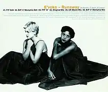 "Runaway" is a song by British female duo E'voke, first released in 1995 as a single. Following the release of their cover of Stevie Wonder's "I Believe" in 1994, the duo recorded the track with producers Barry Leng and Duncan Hannant. The resulting track was signed to Ffreedom (a subsidiary of FFRR) and remixes were commissioned. One of the remixes was accredited to TTF and was similar in sound to TTF's remix of N-Trance's "Set You Free" which had been a major hit earlier in 1995. Jon Campbell of TTF denided that the remix was done by them.[1] A black-and-white music video to a slightly edited version of the Biff & Memphis edit was released which was later released on iTunes in 2011.[2] Upon release, the track reached number 30 in the UK Top 40 in November 1995, before falling to 49 the following week, then to 65.[3] On the UK Dance, "Runaway" reached number three. Later same year, a bootleg remix by Jimmy J & Cru-L-T was released. In 2012, the track was re-released.