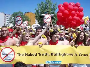 Animal welfare groups across Europe and in North America have promoted the event,[2][3] coordinating low-cost transportation and accommodations for the runners. The event has become an annual alternative festival to the Running of the Bulls. Local citizens, initially offended by the public display of nudity, have become more accepting due to changing morals and because the new event has extended the traditional festival and added to its important economic impact for the town.[4] Organizers work with local government to obtain permits and provide insurance, as required by local law.[5]
