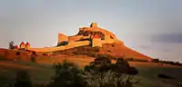 Rupea Fortress (Romanian: Cetatea Rupea, German: Burg Reps, Hungarian: Kőhalmi vár) is a medieval fortress built by Transylvanian Saxons and first mentioned by a 1324 document. It is situated on a 120 m high basalt cliff, to the west of the Transylvanian town of Rupea in Romania.[2] The fortress is located on DN13, 70 km from Brașov, on the road to Sighișoara. It was restored in 2010–2013; as of 2014, it was visited monthly by more than 10,000 tourists.[1]