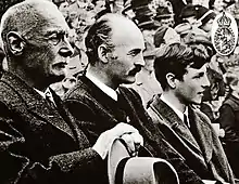 Rupprecht was never enticed to join the Nazis in Germany, despite Hitler's attempts to win him over through Ernst Röhm and promises of royal restoration.[14] The anti-Catholic stance of men like Erich Ludendorff might have been an influence.[15] He helped persuade Gustav von Kahr to not support Hitler during the Beer Hall Putsch.[16] Hitler confided in private to a personal dislike of the Crown Prince. The Crown Prince in turn confessed to King George V at a lunch in London in the summer of 1934 that he considered Hitler to be insane.[17] With the worsening of the Great Depression in 1932, a plan was floated to give Rupprecht dictatorial powers in Bavaria under the title of Staatskommissar. The plan attracted support from a wide coalition of parties, including the SPD and the post-war Bavarian Minister-President (First Minister) Wilhelm Hoegner but the legal appointment of Hitler as Reichskanzler in 1933 by Hindenburg and the hesitant Bavarian government under Heinrich Held ended all hopes for the idea.