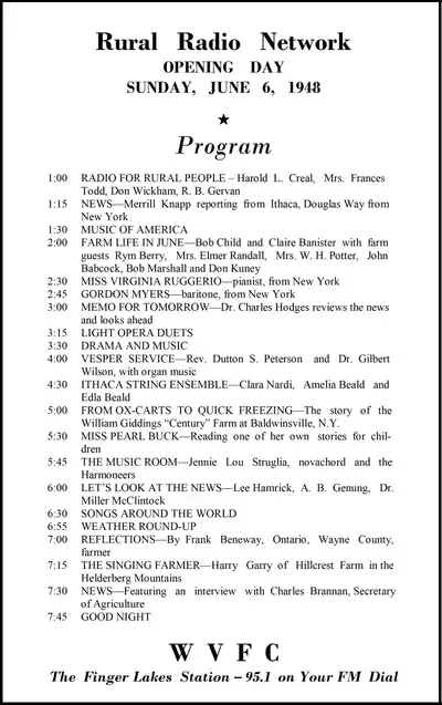 The Rural Radio Network's first day of operation was Sunday, June 6, 1948. According to a newspaper ad published the preceding day, the 1:00 PM inaugural program was a 15-minute feature entitled "Radio for Rural People", followed by a 15-minute newscast. Several more farm-related programs, interspersed with musical interludes, aired until sign-off at 7:45 that evening.