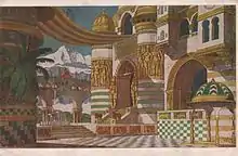 Ratmir is interrupted in his journey by a young maiden who beckons him into a castle, where he finds himself enveloped in luxury. He soon forgets Ludmila. Ludmila eludes Chernomor's henchmen by remaining invisible, but then is tricked by the wizard into revealing herself when he takes the form of Ruslan and calls to her in his voice. He is thwarted by the sound of a horn and hurries off, leaving his hat behind.