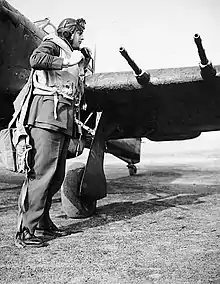 After gaining his commission as an acting pilot officer in the RAF on 5 July,[3] Aitken, who was nicknamed Digger, was posted to Coastal Command, but was then loaned to the Fleet Air Arm as a flying instructor.[4] His acting rank confirmed in May the following year,[5] his instructing work was in relation to the launching of aircraft from catapults.[2] He was also engaged in experimental work, helping to develop radio-controlled aircraft and torpedoes, and was involved in the introduction of the Blackburn Skua into Fleet Air Arm service. He was the first man to fly such an aircraft off a catapult launch.[4]