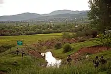 The process of border demarcation continued in February 2013.[57] Russian troops started the installation of barbed wire barriers to separate the South Ossetian territory from the rest of Georgia.[56][58] In some instances, the Georgian residents could not access their plots or come out of their homes because the border of barbed wire runs through or around their property.[56] According to Georgia's Interior Ministry, there was no fencing activities at the administrative border of Georgia’s other breakaway region of Abkhazia, where the Enguri river served as "a natural dividing line", but Russian troops were blocking the pathways to prevent "illegal" movement across the administrative boundary line.[59] The new South Ossetia-Georgia border extended between 50–300 metres (150–1,000 ft) beyond the occupation line.[60][61] By August 2013, an estimated 27 kilometres (17 mi) of barriers had been built.[62]