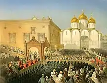 The foundations of the Russian Empire was laid during Peter I's reforms, which significantly altered Russia's political and social structure,[17] and as a result of the Great Northern War which strengthened Russia's standing on the world stage.[18] Internal transformations and military victories contributed to the transformation of Russia into a great power, playing a major role in European politics,[19] given the realities of the new situation in the country. On the day of the announcement of the Treaty of Nystad, the 2 November [O.S. 22 October] 1721, the Senate and Synod presented the Tsar with the titles of the Pater Patriae (Russian: Отец отечества, tr. Otets otechestva, IPA: [ɐˈtʲet͡s ɐˈtʲet͡ɕɪstvə]) and the Emperor of all the Russias.[20] It is generally accepted that with the adoption of the imperial title by Peter I, Russia turned from a tsardom into an empire, and the imperial period began.[21][22]
