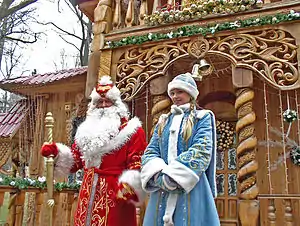 Since the era of the Soviet Union, Novy God has usually been considered a gift-giving holiday with similarities to Christmas (albeit in a secular form), with New Year trees (yolka) decorated and displayed in homes and public spaces,[3][4][5] and Ded Moroz (Russian: Дед Мороз, lit. 'Grandfather Frost') depicted as delivering presents to children on New Year's Eve (similarl to the Western figure of Santa Claus),[6][4][5] with assistance from his granddaughter Snegurochka (Russian: Снегурочка, lit. 'the Snow Maiden').[7]