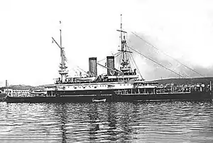 Tri Sviatitelia was named after the Three Holy Hierarchs of the Eastern Orthodox Church. She was built by Nikolayev Dockyard and laid down 15 August 1891, although actual construction had begun about January 1891. The ship was launched 12 November 1893 and transferred to Sevastopol for completion the following year. Officially she entered service in 1895 with the Black Sea Fleet, but her sea trials did not begin until September–October 1896.[16] In 1899 Tri Sviatitelia became the first ship in the world to be fitted with a radio, an installation designed by the Russian physicist Alexander Stepanovich Popov that had a range of about 3 miles (4.8 km).[17] The ship was flagship of Rear Admiral F. F. Vishnevetskii during the failed attempt to recapture the mutinous battleship Potemkin on 30 June 1905.[18] Her forward fighting top was removed about 1908.[19]