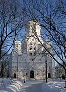 Russian churches often have various recurrent elements in their architecture. The onion dome is for example a recurrent and important element in the architecture of Russian churches. Often Russian churches have also multi-colored filigree ornamental elements. Furthermore the colour white plays an important role in the style of Russian churches. In the past, Russian churches were made out of wood.[1][2][3] Many Russian Orthodox churches are distinguished by their verticality, bright colors and multiple domes, which provide a striking contrast with the flat Russian landscape, often covered in snow. The very first churches in Kievan Rus', such as the 13-domed wooden Cathedral of St. Sophia, Novgorod, differed in this regard from their mainly single-dome Byzantine predecessors. The number of domes was important symbolically. One dome symbolized the single God; three represented the Trinity, and five represented Christ and his four evangelists.[4] At first the baptistery, narthex, and choir gallery above the narthex were a common feature of Rus' churches, but gradually they disappeared. After a century of Byzantine imitations, the Russian masons began to emphasise the verticality in church design.