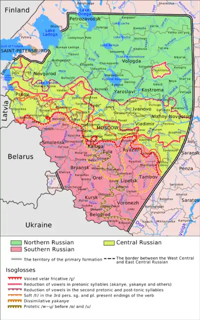 - Northern, in the northern and north-eastern parts of European Russia, from Veliky Novgorod to the Perm and northern Ural regions; this has no or little vowel reduction in unstressed positions and stop /ɡ/.