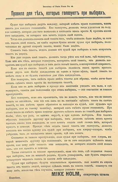 Since 2012, New York State institutions provide free interpretations from/into Russian. Also, some state and elections documents are translated into it. [9]