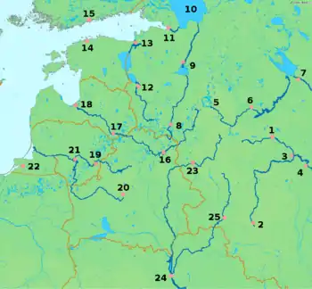 Ik, Ilek, Indigirka, Ingoda, Instruch, Iokanga, Irkut, Irtysh, Iset, Ishim, Istra, Izhora, Kama, Kamo River (Russia), Kamchatka, Kashinka, Kasplya, Katanga, Katun, Kazanka, Kerzhenets, Ket, Khatanga, Kheta, Khopyor, Kirenga, Klyazma, Kolva (Usa), Kolva (Vishera), Kolyma, Kondurcha, Kosovka, Kosovoy, Kostroma, Kotorosl, Kotuy, Kozhim, Krasnaya River, Kuban, Kubr, Kuma, Kunya, Laba, Lama, Lava/Łyna, Lena, Lovat, Lower Tunguska, Luga, Lyutenge