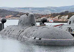 Project 971 has a double-hull design. The robust body is made of high quality alloy steel with σт = 1 GPa (10,000 kgf / cm²). To simplify the installation of equipment, the boat was designed using zonal blocks, which made it possible to transfer a significant amount of work from the cramped conditions of the sub's compartments directly to the workshop. After completion of the installation, the zonal unit is “rolled” into the hull of the boat and connected to the main cables and pipelines of the ship's systems.[5] A two-stage damping system is used: all mechanisms are placed on damped foundations, in addition, each zone unit is isolated from the body by rubber-cord pneumatic shock absorbers.[5] In addition to reducing the overall noise level of nuclear submarines, such a scheme can reduce the impact of underwater explosions on equipment and crew.[6][5] The boat has a developed vertical tail unit with a streamlined boule, in which the towed antenna is located. Also on the submarine are two reclining thrusters and retractable bow horizontal rudders with flaps. A feature of the project is the smoothly mated connection of the tail unit to the hull. This is done to reduce noise-generating hydrodynamic eddies.