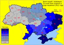 The Ukrainian language was hit the most by the Russification. Russification policy was more intense in Ukraine than in other parts of the Soviet Union, and the country now contains the largest group of Russian speakers who are not ethnically Russian: as of 2009, there were about 5.5 million Ukrainians whose first language was Russian. Russian speakers are more prevalent in the southern and eastern half of the country, while Ukrainian is more used in central Ukraine (excl. bigger cities, like Kyiv or Poltava) and Ukrainian dominates in western Ukraine, having almost no Russian speakers and ethnic Russians.[13] Some of these "russified Ukrainians" speak Russian, while others speak a mix of Ukrainian and Russian known as "surzhyk"; many Ukrainian speakers recognize "surzhyk" as a bigger problem than Russian, because it ruins the Ukrainian language and is a mix of Ukrainian and Russian vocabulary and grammar.[14] Estimates of the "russified Ukrainians" prevalence in the country vary, but according to different studies, "russified Ukrainians" comprise a third to a half of the total population of Ukraine.[15] Generally, Ukrainian dominates in the villages in the whole country; even in eastern Ukraine, Ukrainian is common in villages, where it's actually considered to be the real "clean" Ukrainian without any influence from other languages.[16] However, the only part of Ukraine, where Ukrainian completely dominates and Russian is rare to hear, is western Ukraine (especially Galicia). That's because western Ukraine is the only part of Ukraine, that wasn't a part of Russia for a long time, like the rest of the country. A part of western Ukraine (e.g. Volhynia) became a part of the Russian Empire for the first time around the 1800s, while Galicia, Bukovina and Zakarpattia fully became a part of the Soviet Union for the first time just in 1945, after WW2.