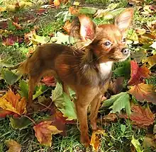 The Russian Toy (also known as the Russian Toy Terrier, and in Russia as the Russkiy Toy , Russian: Русский той) is a very small breed of dog originally bred in Russia from the English Toy Terrier. There are two types of coats in the breed: smooth coat and long coat. The smooth-coated variety was previously known as the Russian Toy Terrier and long-coated as the Moscow Long-Haired Toy Terrier. Both were brought together under the same Russian Toy Terrier name in 1988 and the "Terrier" was dropped from the name when the breed was added in 2006 to the official list of breeds registered with the Fédération Cynologique Internationale[1] and has been registered in the Foundation Stock Service of the American Kennel Club since 2008, allowed to compete in AKC companion events since 2010.[1][2] The first official breed standard of the two varieties was written in 1966 in Russia.[1]