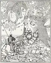 Ruslan, having come upon a foggy desert strewn with weapons and bones from a past battle, wonders at the cause of this scene and whether he, too, may end up the same way. He chooses a new shield and spear from the ground to replace his broken weaponry, but cannot find a sword heavy enough to complete his new set of armor. When the fog lifts, a giant Head is revealed and blows through its lips to bring up a storm so as to drive Ruslan away. When Ruslan strikes the head with his spear, the Head falls back and reveals a sword underneath. He takes it and asks the Head whence it came. As it is dying, the Head explains that it once was a giant, and his dwarf brother is the evil sorcerer Chernomor. The sword was destined to kill both of them; so, in order to forestall fate, Chernomor tricked the giant, beheaded him, and flew his live head away to the distant desert to keep the sword protected underneath it. With the sword now in Ruslan's hands, the Head calls for vengeance on Chernomor.