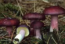 Russula sardonia, commonly known as the primrose brittlegill, is a mushroom of the genus Russula, which are commonly known as brittlegills. The fruiting body, or mushroom, is a reddish-purple, the colour of blackberry juice, and is found in coniferous woodland in summer and autumn. It is inedible, and like many inedible members of the genus, has a hot, peppery taste.