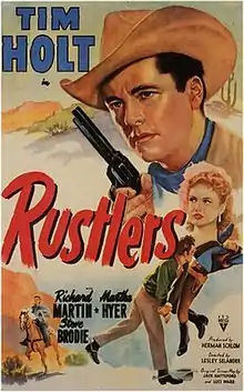 Rustlers is a 1949 American Western directed by Lesley Selander. The film is a Tim Holt B Western about a group of Arizona ranchers intent on stopping a gang of cattle rustlers.[2]