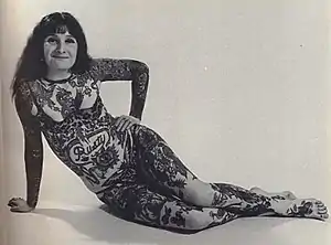 Skuse, a driver in the Women's Royal Army Corps based at Aldershot in Hampshire, had her first tattoo aged 17 in 1961, which resulted in her being put on a charge.[1] By 1964 she had 62 tattoos and was becoming widely known.[2] Soon she was spending more than half her Army pay on getting more tattoos from her future husband, Bill Skuse, at his studio in the amusement arcade in Aldershot's High Street. She turned down an offer from a showman in Glasgow, Scotland to become a tattooed attraction; however, the offer convinced her to get tattooed completely. Using £100 given to her by her mother as a 21st birthday present, Skuse spent the money on more tattoos, much to her mother's consternation.[1]
