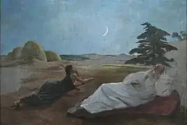 Religious art was an unusual theme for Bazille, who is more associated with landscapes and portraits. This painting is a night scene from the Book of Ruth in the Old Testament, depicting the patriarch Boaz sleeping under a night sky with a crescent moon. According to the Bible, Boaz notices Ruth, a widowed Moabite and relative of his, gleaning grain in his fields. He soon learns of her difficult circumstances, as well as her kindness and loyalty to her mother-in-law, Naomi. In the evening, acting on the instructions of Naomi to seduce Boaz, Ruth visits him while he is sleeping and places herself under his power. He later agrees to marry her, and their grandson is David. Bazille depicts Ruth at some distance to Boaz, with her head raised on one elbow. Although her breast is provocatively exposed, she is gazing pensively at the moon instead of the sleeping Boaz. The theme of Boaz and Ruth was a popular theme with the Paris Salon orthodoxy at the time, and this work may have been reaction by Bazille to the Salon's rejection of his La Toilette earlier that year. However, the scene he chose draws heavily on Victor Hugo's poem Booz endormi, from his 1859 La Légende des siècles. Bazille had also visited the studio of Alexandre Cabanel in 1869 and had an opportunity to see Cabanel's version of Ruth et Booz, based on the same poem.